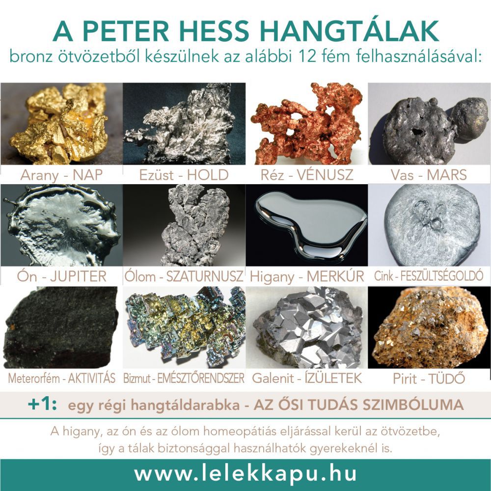 A bolygókhoz tartozó 7 fém mellett még 5 másik is bekerült az ötvözetbe, így a Peter Hess tálak az ősi tradíciók alapján - napjainkban egyedülálló módon - 12-féle fém ötvözetéből készülnek, amelyekben bizonyos fémek rezgései homeopátiás eljárással kerülnek az ötvözetbe. A Peter Hess tálak nem bocsátanak ki káros anyagokat, szemben azokkal az olcsóbb hangtálakkal, amelyekben sok esetben a cinket ólommal helyettesítik, valamint a minőségi anyagok helyett gyakran fémhulladékot használnak. Ebből adódóan egy hangtál megvásárlásánál fontos szempont ismerni a tál eredetét.