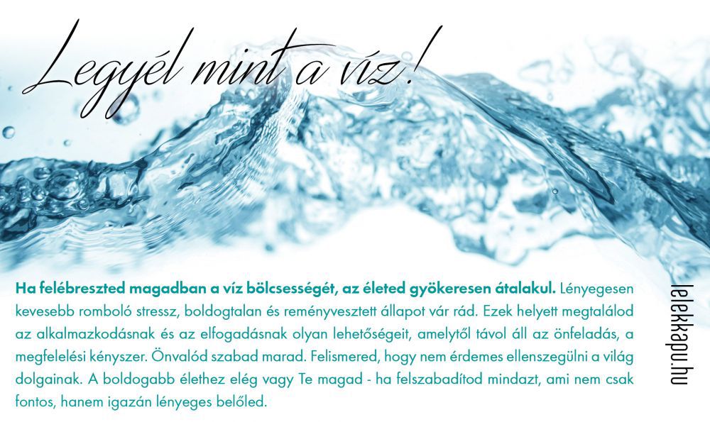 Ha felébreszted magadban a víz bölcsességét, az életed gyökeresen átalakul. Lényegesen kevesebb romboló stressz, boldogtalan és reményvesztett állapot vár rád. Ezek helyett megtalálod az alkalmazkodásnak és az elfogadásnak olyan lehetőségeit, amelytől távol áll az önfeladás, a megfelelési kényszer. Önvalód szabad marad. Felismered, hogy nem érdemes ellenszegülni a világ dolgainak. A boldogabb élethez elég vagy Te magad - ha felszabadítod mindazt, ami nem csak fontos, hanem igazán lényeges belőled.